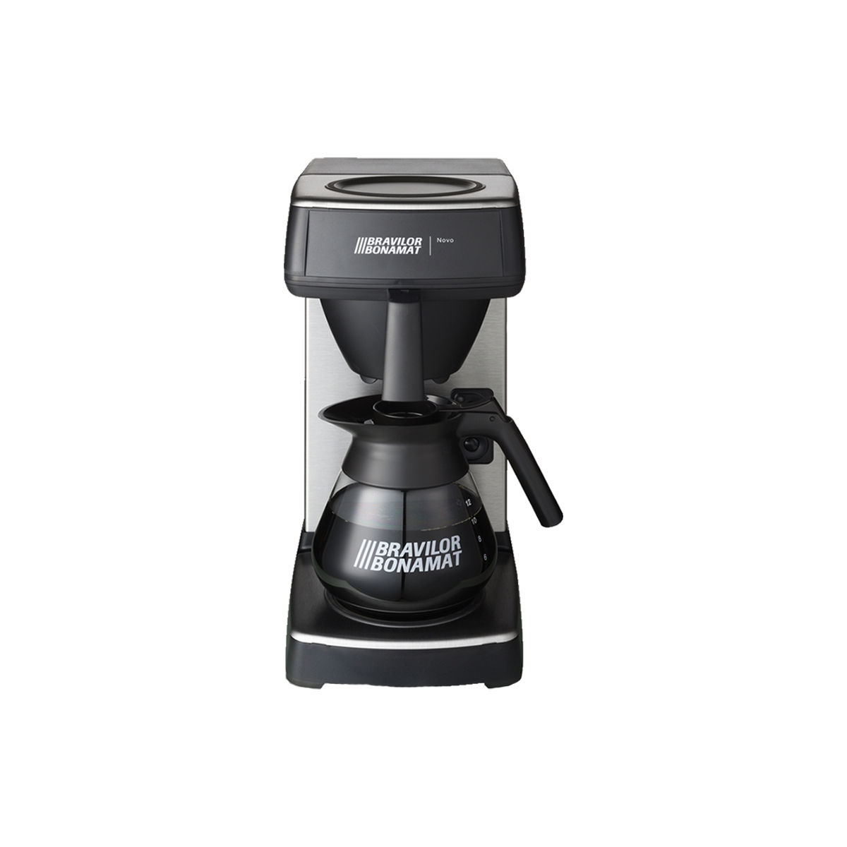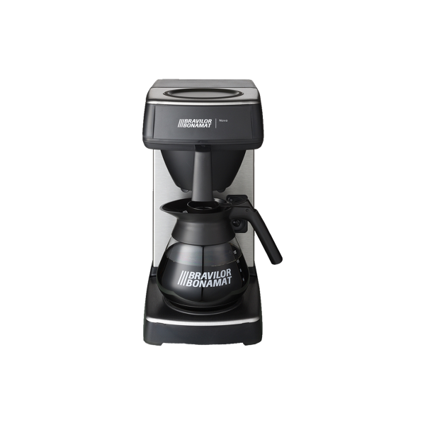 Su bağlantısı olmayan yerler için hızlı filtre kahve makinesi. Bravilor Bonamat Novo filtre kahve makinesi kutusu yanında 1.7 litrelik bir cam pot, ölçü kaşığı ve 85*245 mm filtre kağıdına sahiptir.